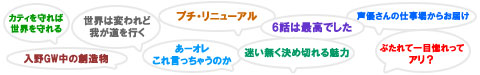 | 今週のモバイルラジオは? 今週のモバイルラジオは、高垣さんがスタジオに登場! フェルトからの世論調査に一同びっくり! さらに入野さん&高垣さんのサイン入り番組Tシャツをプレゼント! 応募はモバイルサイトから受け付けていますので、是非チェックしてください! |