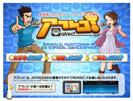 JOYSOUNDの最新カラオケ「CROSSO」で提供中のアフレコ体験サービス『アフレコ!』の公式ページが、バンダイナムコゲームス公式サイト内にオープンした。