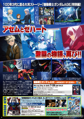 ガンダムシリーズからは、いよいよ7月26日(金)に発売が迫った「機動戦士ガンダムAGE ~MEMORY OF EDEN~」の特集や、8月28日(水)に発売予定の「機動戦士ガンダム Blu-rayメモリアルボックス」の特典内容の詳細紹介ページなどを掲載。冊子を見かけたらぜひ手に取ってみよう。
