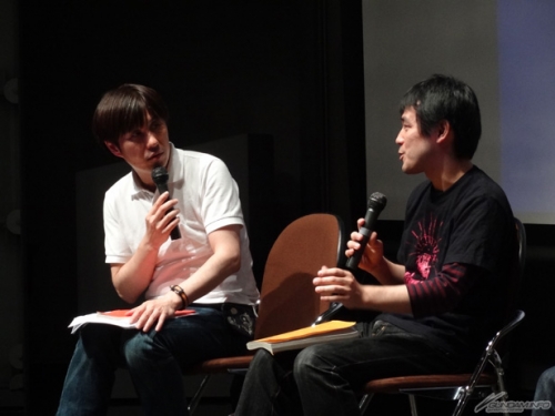 ▲司会と監督の手元にあるのが本作の台本。激闘編である後編よりも倍以上の厚みがある前編の台本はそれだけ内容の濃さを表している、と話す。