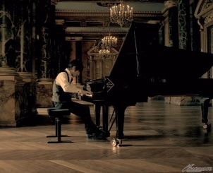 ビスト邸を思わせるフランスの古城に入っていく澤野弘之氏。そこで『機動戦士ガンダムUC』の印象的な楽曲をピアノとヴァイオリンで奏でることで、アニメーションの名場面や物語を取り巻くキャラクターたちと遭遇する。