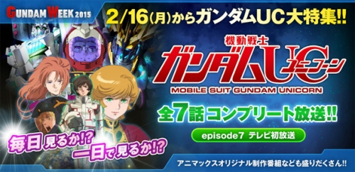 アニメ専門チャンネル「アニマックス」にて2月に実施される「ガンダムウィーク2015」では、2月16日(月)より『機動戦士ガンダムUC』が大特集される。