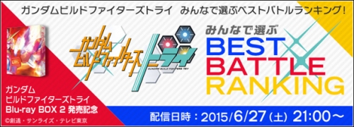 「ガンダムビルドファイターズトライ Blu-ray BOX 2」の発売を記念する特別番組「『ガンダムビルドファイターズトライ』みんなで選ぶベストバトルランキング!」は、いよいよ本日6月27日(土)21:00より「バンダイチャンネル」特設ページにて無料ライブ配信される。