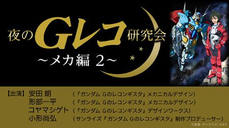 映像では『ガンダム Gのレコンギスタ』の小形尚弘プロデューサーと、ゲストの安田 朗氏、形部一平氏が語るメカニカルデザインについてのエピソードに加えて、デザインワークスのコヤマシゲト氏が登場。前回語り切れなかった「G-レコ」のモビルスーツについてのトークなど、盛りだくさんの内容が楽しめる。