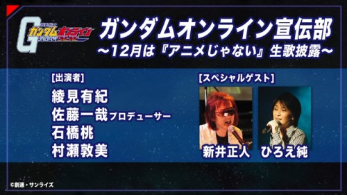12月14日(水)にLINE LIVEで配信された「ガンダムオンライン宣伝部 ~12月は『アニメじゃない』生歌披露~」のアーカイブ配信が、バンダイチャンネルにて開始された。