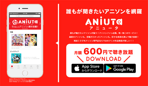 ANiUTaとは、アニソン・ゲーム音楽・ボーカロイド音楽に特化した定額の音楽聴き放題サービスで、専用アプリを使って5万曲超を月額600円(税込)で楽しむことができる。