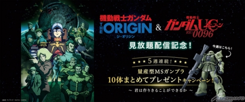 映像配信サービス「U-NEXT」では、『機動戦士ガンダム THE ORIGIN』と『機動戦士ガンダムユニコーン RE:0096』の見放題配信を記念して、「量産型MSガンプラ10体プレゼントャンペーン」が実施中だ。