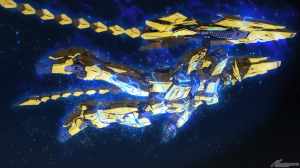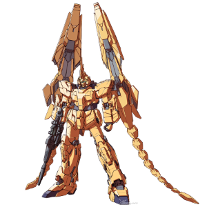 試験用に先行納入されたフル・サイコフレームの素体をもとに、白い1号機と黒い2号機の建造データを反映して組み上げた金色のユニコーンガンダム3号機。U.C.0095、暴走事故を起こし、行方不明となっている。