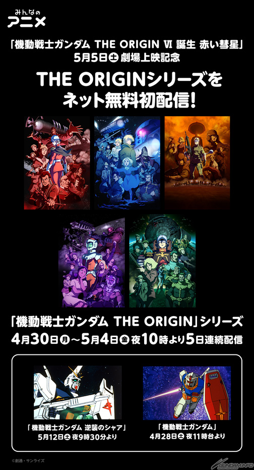 配信は、5月5日(土・祝)より全国35館の劇場にて上映がスタートする『機動戦士ガンダム THE ORIGIN 誕生 赤い彗星』の公開を記念したもので、「みんなのアニメチャンネル」にて4月30日(月・祝)から5月4日(金・祝)の5日間、各1話ずつ毎日22:00より配信。『機動戦士ガンダム THE ORIGIN』では、初のネット無料配信となっている。