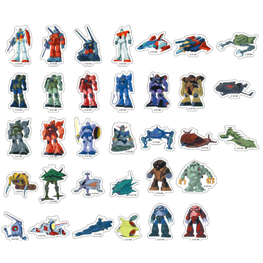 『機動戦士ガンダム』に登場するモビルスーツ・モビルアーマーの、当時の設定画を使用したミニステッカーが登場!ステッカーは弱粘タイプで、くり返し貼ったり、剥がしたりすることができる。1パックステッカー33枚入り。