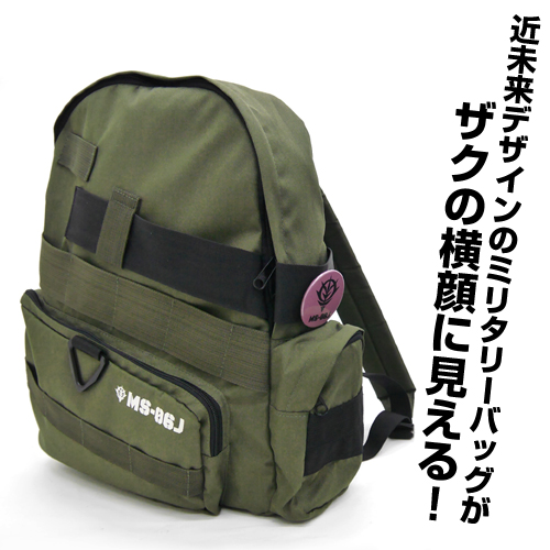 近未来的なデザインが特徴的なミリタリー系バッグ、と思いきや、全体を見るとなんとザクの横顔になっているという技ありのデイパック。