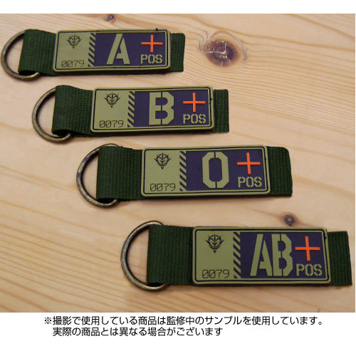 PVC製のジオン血液型キーホルダーは、血液型を示すA+、B+、O+、AB+とそれぞれが表記されたバージョンがあり、自分の血液型に合わせたタイプを選ぶことができる。
