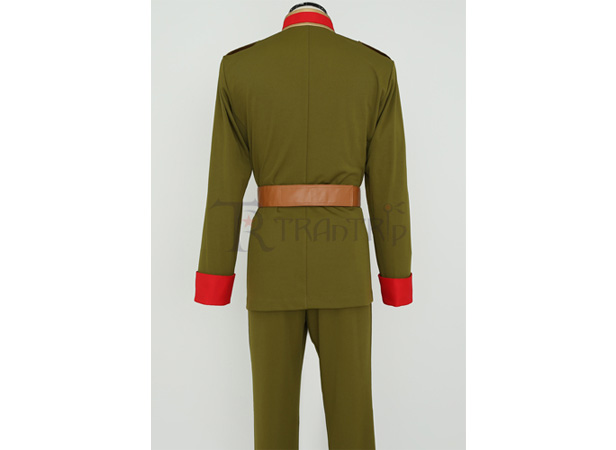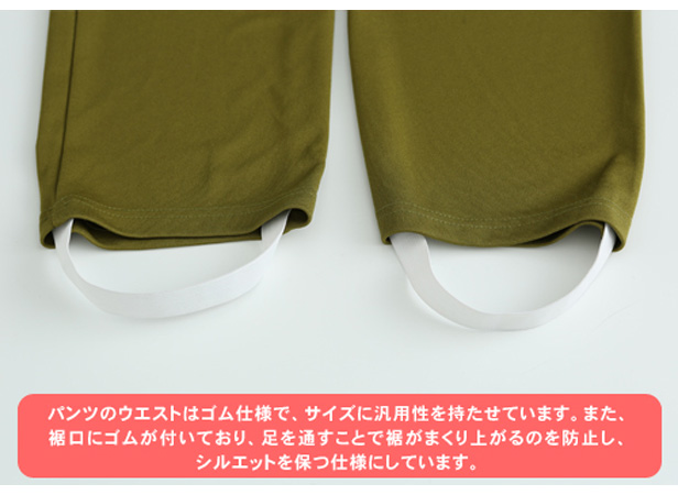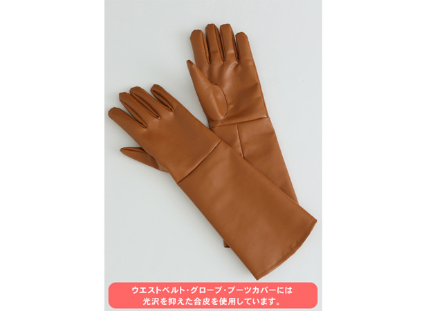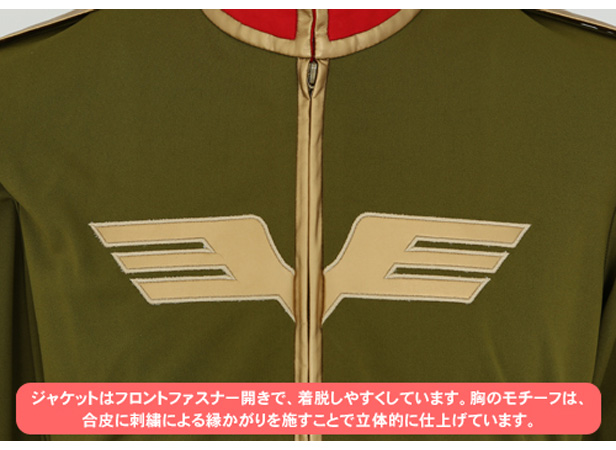 ジャケット・パンツは、伸縮性に優れた生地を使用することでサイズに高い汎用性を実現させている。ジャケットはフロントファスナー開きで、着脱しやすい仕様。さらに胸のモチーフは、合皮に刺繍で縁かがりを施すことで立体的に仕上げられているほか、袖口には設定にあわせて、赤いカフスが付いている。また、パンツのウエストはゴム仕様で、サイズに汎用性が付加されている。裾口にはゴムが付いており、足を通すことで裾がまくり上がるのを防止し、シルエットが保たれる仕様となっている。