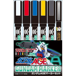 『機動戦士ガンダムAGE』に登場する「ガンダムAGE-1 ノーマル」をリアルにグレードアップすることができるプラモデル用マーカー5色と、スミいれ筆ペン(ブラック)のマーカーセット。