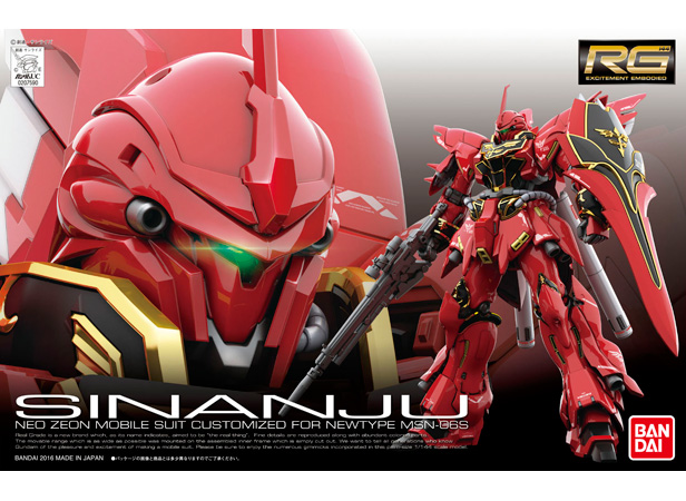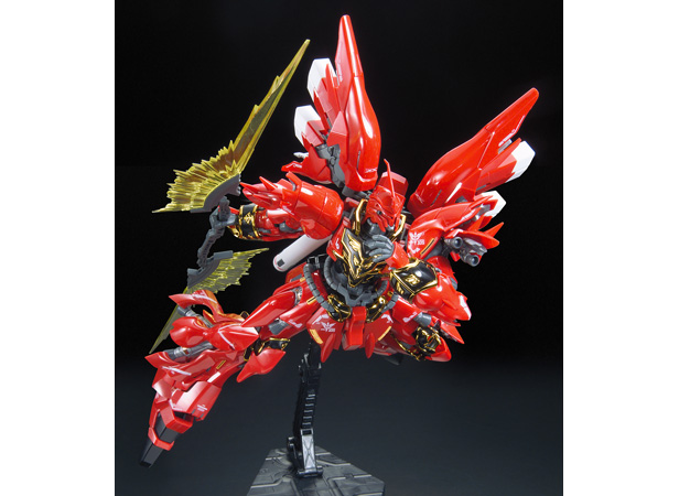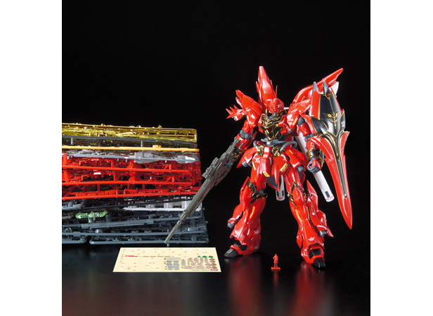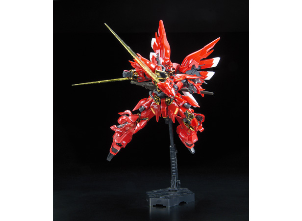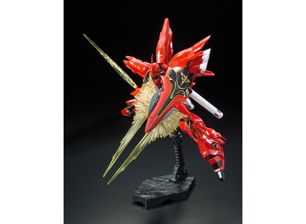 『機動戦士ガンダムユニコーン RE:0096』より、フル・フロンタルが搭乗する真紅のMS「シナンジュ」がついにRG化。ロケットエンジンなどの実機考証によりデザインアレンジされた背面のフレキシブルスラスターは、内部メカを見せながら開閉するなど、可動ギミックが進化。金色のエングレービングはメッキ加工で、ベースとなる赤はグロスインジェクションで、それぞれ質感表現され、美しく輝く。カトキハジメ氏描き下ろしの高密度なディテールを全身に反映。