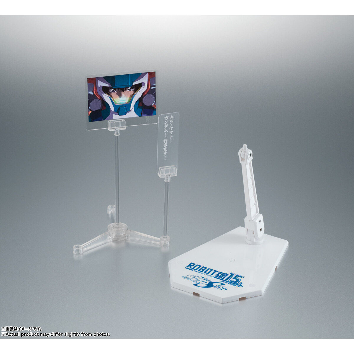 発売中の「ストライクガンダム ver. A.N.I.M.E.」と「エールストライカー&エフェクトパーツセット ver. A.N.I.M.E.」をアッセンブル!さらにROBOT魂15周年を記念したオリジナル台座とキャラクターカットインシートが新たに付属!一部セット内容や彩色を整え「GAT-X105+AQM/E-X01エールストライクガンダムver.A.N.I.M.E.」として登場!