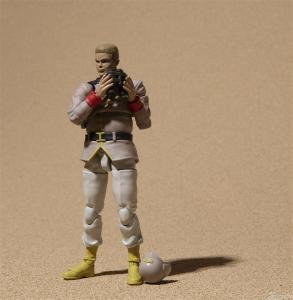 「地球連邦軍一般兵士02」は彩色済み完成品で全高約10cm(約1/18スケール)、ガッチリとした体型の男性兵士です。オプションパーツとして制式拳銃、制式ライフル、ホルスター等の基本セットに、E-02専用としてハーネス、その他差し替え用手首等の付属品も多数付属します。