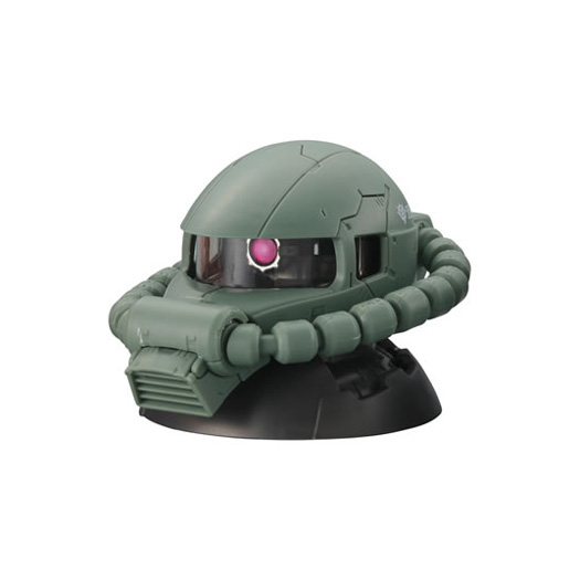 球状で排出された状態から、パーツを取りだして組み立てることで、ザクの頭部モデルが完成する。全高約6.5cmの大ボリューム、精密造形という点だけでなく、モノアイの可動や頭部、パイプ基部の展開などギミックも充実したハイクオリティモデルだ。