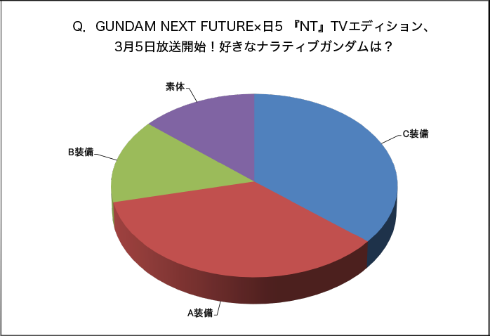 が36ポイントの支持を集めた。アナハイム・エレクトロニクス社が開発したサイコフレームの試験機として設計されたナラティブガンダムだが、実戦投入され、試験機ならではの高い拡張性を証明したのが、このC装備である。C装備という呼称は、便宜上の名前であり、「サイコ・パッケージ」とも呼ばれたようだ。