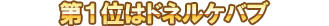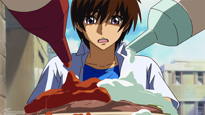 北アフリカの都市バナディーヤでキラ・ヤマトとカガリ・ユラ・アスハが注文していたのがこのドネルケバブである。そこに“砂漠の虎”の異名を持つアンドリュー・バルトフェルドが登場し、自信満々にヨーグルトソースを勧めてきたのが印象的だった。劇中では、カガリとバルトフェルドがドネルケバブにかけるのはヨーグルトソースかチリソースかで言い争うことになるのだが、個人的にはチリソースが1、ヨーグルトソースが3の割合が良いと思っている。読者のみなさんはどうだろうか。食べたあとは口と手が汚れる場合があるので、鑑賞後にガブリとかぶりつきたいフードである。