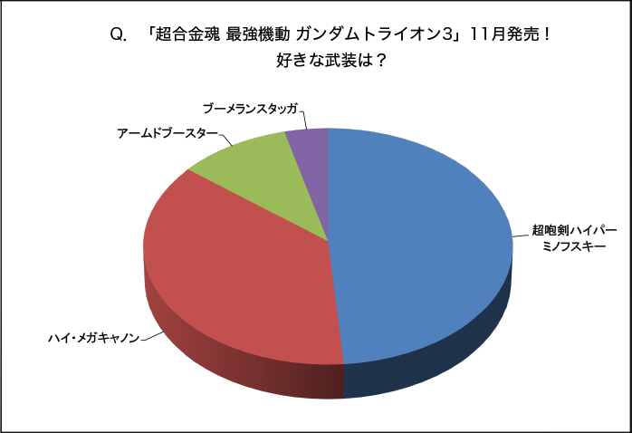 選択肢に挙げた以外にもライガーグレア、ヒートウイング、ダブルキャノネード、ラプターブレイカーと多くの武装を持つガンダムトライオン3だが、今回の調査で半数近い支持を獲得しているとおり、やはり超咆剣ハイパーミノフスキーの存在が大きいようだ。超咆剣を使った必殺技「超咆剣ハイパーミノフスキー・トライザン」を決めるためには、衝撃波の波長をプラの物質振動数とシンクロさせて機体を操作不能にするライオンの咆哮を相手に浴びせる必要がある。この技がまたお月さまみたいで美しいのだ。