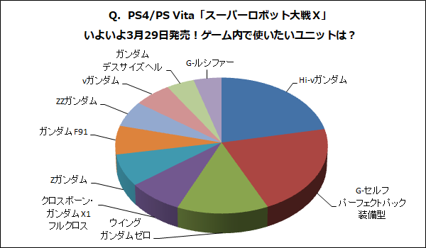 興味深いことに、8位のνガンダムは5.9ポイント。そして、前回の作品別『機動戦士ガンダム 逆襲のシャア』は5.8と、ほぼ同じポイントだった。つまり、Hi-νガンダムとνガンダムは「作品」=「このガンダム」という印象が強いようだ。逆に『ガンダム Gのレコンギスタ』ファンの場合は、G-セルフ(パーフェクトパック装備型)派は約半数と推察される。残りは3位以降に分散したようだ。3位以降のウイングガンダムゼロ、クロスボーン・ガンダムX1フルクロス、Ζガンダム、ガンダムF91、ΖΖガンダムはそれぞれ0.6~2ポイント強支持率を増やす結果となったからである。