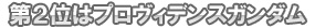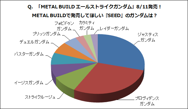 が29.1ポイントを獲得した。2位のプロヴィデンスガンダムとは0.1ポイントの僅差であった。フリーダムガンダムやデスティニーガンダムはすでに登場しているので、今回の選択肢から外れている。キラとシンの機体はMETAL BUILD化されているのに、アスランの機体が無い。放送当時はキラとアスランで人気を二分するほどだったことを考えると、アスランのファンにはちょっと辛い。ファンに女性が多かったことも影響しているのかもしれないが、赤い機体だし、ぜひとも何とかして欲しいものである。