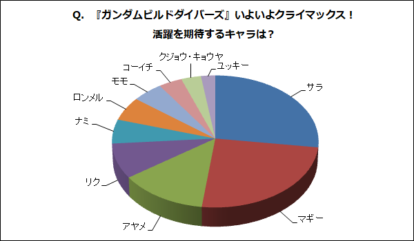 が27ポイント強の支持を集めた。GBNにログインしたリクが出会った不思議な少女。ガンプラに込められたビルダーの気持ちを理解する特殊な力を持っていたが、電子生命体「EL(エル)ダイバー」であることが明かされた。そして彼女の存在が、GBNを崩壊させる原因となってしまうこともわかり、運営サイドはサラの引き渡しを要求してきた。活躍するといっても、サラはガンプラを持っていないし、操縦することもできないので、戦闘することはできない。なにか特殊な能力で、事態を改善する能力を持っているのだと思われたのだろう。