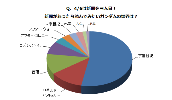 が過半数を超える支持を集めた。『機動戦士ガンダム』から『機動戦士Ζガンダム』、『機動戦士ガンダムΖΖ』と続き、『機動戦士Vガンダム』へと連り、アムロ、シャア、カミーユ、ジュドー、ウッソたちが活躍した時代である。『機動戦士ガンダムF91』のほか、最近では『機動戦士ガンダムUC』や『機動戦士ガンダムNT』も宇宙世紀を舞台としており、この作品数の多さが高い支持につながったと思われる。さらに、現在制作中の『機動戦士ガンダム 閃光のハサウェイ』の展開を楽しみにしている声も多かったように感じる。