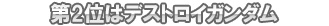 が16ポイント強の支持を集めた。しかし、1ポイントの僅差でレジェンドガンダム、グフイグナイテッドの猛追を受けた。デストロイガンダムは黒くて大きなガンダムだ。頭頂高38mもあり、多数の敵を一気に消滅させうる強力な火器を多数装備しているほか、パイロットにはエクステンデッド(強化人間)が必要とされるなど、『機動戦士Ζガンダム』のサイコ・ガンダムのようであった。ザフトの駐留軍もろとも、ヨーロッパ各地の都市を焼き払っていくシーンが恐ろしい。そして、最初のパイロットにさせられたステラ・ルーシェが、好意を持っていたシン・アスカの前で、絶命するシーンがとても悲しかった記憶がある。