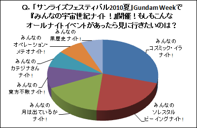 「Q.「サンライズフェスティバル2010夏」Gundam Weekで『みんなの宇宙世紀ナイト!』開催!もしもこんなオールナイトイベントがあったら見に行きたいのは?」はみんなのコズミック・イラナイト!が1位!【2010年7月5日~2010年7月11日】