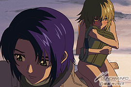 | 第2位はアスランとカガリが15ポイント弱の支持を得た。3位のシローとアイナ、4位のマリューとムウとは2ポイントほどの差しかなく、接戦であった。7月7日の段階では、シローとアイナ、マリューとムウの下だったのだが、最後の追い込みで2位に躍り出た。プラントに歌姫の許嫁がいるのに、無人島での一夜を境に心変わりしてしまったアスラン。極限状態での出会いは「つり橋効果」ともいわれるが、結婚式の花嫁カガリを奪いにくるのがキラでなくてアスランだったら、もっとドラマチックで効果が上がったのかもしれない。 | ![]() |