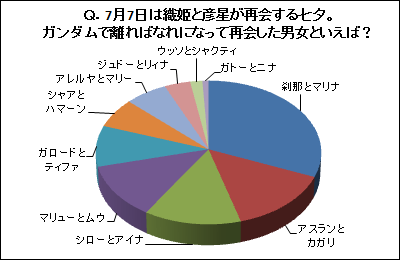 「Q.7月7日は織姫と彦星が再会する七夕。ガンダムで離ればなれになって再会した男女といえば?」は刹那とマリナが1位!【2011年7月4日~2011年7月10日】