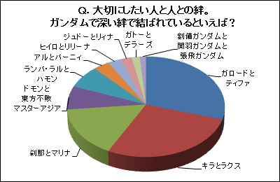 第2位は「キラとラクス」が28ポイント弱の支持を集めた。第3位は「刹那とマリナ」が16ポイント弱であった。さすが主役のカップルは強い。同様の男女のカップルとして「ヒイロとリリーナ」も該当するのだが、こちらは7位に甘んじた。最下位となった「劉備ガンダムと関羽ガンダムと張飛ガンダム」であったが、彼らの義兄弟の契りは実は「絆」よりも深いような気がする。同性同士の「絆」としては「ドモンと東方不敗マスターアジア」「アルとバーニィ」が挙げられる。こちらは先輩と後輩という関係であった。のこりの「ランバ・ラルとハモン」は愛人。「ジュドーとリィナ」は兄妹であった。 |