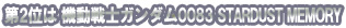 新機動戦記ガンダムW Endless Waltz(23.84%) 機動戦士ガンダム0083 STARDUST MEMORY(23.51%) 機動戦士ガンダム 第08MS小隊(15.76%) 機動戦士ガンダム0080 ポケットの中の戦争(15.39%) 機動戦士ガンダムSEED C.E.73-STARGAZER-(15.08%) 機動戦士ガンダム MS IGLOO(4.34%) GUNDAM EVOLVE(2.09%) (回答4543人) |