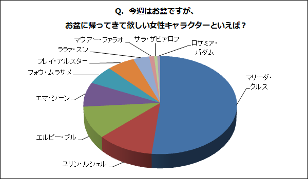 『Q.今週はお盆ですが、お盆に帰ってきて欲しい女性キャラクターといえば?』はマリーダ・クルスが1位!【8/11~8/17】