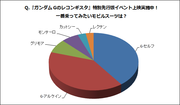 特別先行版のイベント上映が始まっていたので、画面で活躍したモビルスーツの人気が高くなるのかと思ったのだが、それほど大きな影響は見られず、「G」の付く機体に人気が集中した。公式サイトでG-アルケインはアイーダの乗る機体と明かされているので、アイーダファンの期待を集めたのかもしれない。