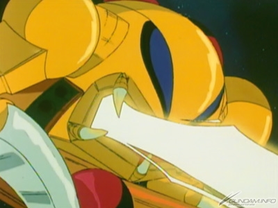 ザクレロとえいば、顔や口はいかにも怖い。目は吊り上り、口は大きく開き、キバがはえている。しかし、ビビッドな黄色い機体とそのやられ方を見ると、つい思ってしまう、「ファニー」だと。なるほど、怖い要素を突き詰めていくとカワイく見えてしまうことがあるのかもしれない。