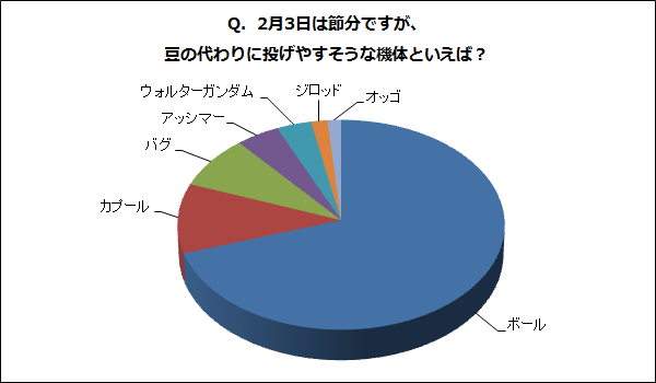 恒例の季節ネタである。節分ということで、豆の代わりに投げやすい機体を調査してみた。ボール、カプール、ウォルターガンダムなど丸いものはいい、アッシマーもまあ丸いほうなのでいいとしよう。しかし、ジロッドは投げたらどこ行くかわからんではないか。オッゴに至っては丸くないし。バグに至ってはなんかケガしそうだ…などという選択肢への突っ込みはさらっと流して、早速調査結果を見てみよう。