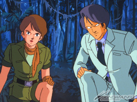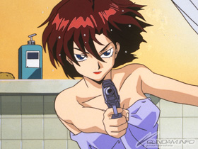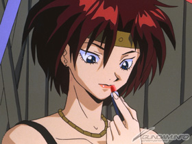 さらに続いては『エニル・エル』(『機動新世紀ガンダムX』)。ガンダム史上、もっとも露出度の高い(!?)セクシー姐さんキャラとして愛されている彼女は、元宇宙革命軍士官、ナーダ・エル少将と地球の女性との間に産まれた娘です。もともとフリーのモビルスーツ乗りとして名の通っていた彼女ですが、あることからガロード・ラン(『機動新世紀ガンダムX』の主人公)に興味を持ち、GX(ガンダムX)を奪うべく酒場で誘惑、その後、あやし~い雰囲気(!?)を漂わせて深夜、彼の部屋に訪れたものの、肝心なところでなぜか銃を向けられ拒絶されたことにより“女のプライド”をいたく傷つけられ激怒(!)。その後はフリーデン(ガロードが搭乗していた戦艦)を執拗に攻撃したりと、ずっとガロードをつけ狙いつつ、なかばストーカーチックにいろんな手段で彼を殺そうと……(←コワイっす~~~~)。