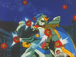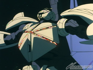 胸部のX型の傷はかつて∀ガンダムと戦った時についたという話もあるだけに、この2機の因縁は深くて、最期はやはり∀ガンダムと同時に月光蝶システムを発動させて、双方身動きのできないままに落下、その後は(なぜか)パイロット同士が日本刀で切り合いになるというスゴい展開になっていくのですが……。