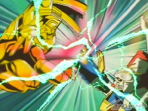 必殺技もいくつかあって、そのひとつ、ローゼススクリーマーは、四方八方に飛ばしたローゼスビットで結界を作り、電撃でビリビリと相手を痛めつけるという技です(でも一つのビットが破壊されると他のビットも次々と誘爆しちゃうの……)。続く新・必殺技のローゼスハリケーンは、ローゼスビットを敵の周囲でぐるんぐるんと回転させて、これでもか! というほどの大きなエネルギーの奔流で相手を巻き込んでしまうというもの。これはギアナ高地での修行(!?)でジョルジュが得たという明鏡止水の境地(機体が金色に光り輝く)を経てからの攻撃方法ですが、残念ながら主人公のドモンにはあんまり効果がなかったようです(最初は圧倒してたのに……無念)。