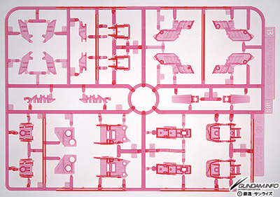 ▲全身に組み込まれたサイコフレームを再現するための特殊集光樹脂製パーツ。デストロイ(NT-D)モード発動時の発光をイメージした素材だ。