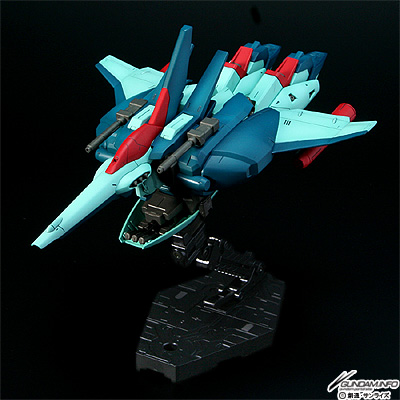 リ・ガズィといえば、Ζガンダムの流れを受け継いだデザインとB.W.S.(バック・ウェポン・システム)だが、このHGUCではそれらを高い次元で追求している。スマートさの中に力強さを感じさせるプロポーションの本体は各関節の可動域も広く、劇中のイメージに近いアクションポーズを取らせることができる。B.W.S.によるスペース・ファイター形態への変形機構ももちろん再現されており、パーツそのもののシャープさもあって変形後の一体感が非常に高い。