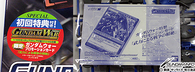 ▲(上)パッケージサイズは31×20×11cm。ランナー×12(内、合成ゴムパーツ×1、ポリキャップ×1)、説明書、シールが同梱されている。(下)初回特典として限定ガンダムウォープロモーションカードが封入されている。このシールが目印だ。