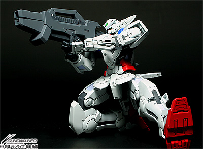 ▲GNランチャーを構えて、大胆にポーズを取ってみた。肩や腰に採用された新機構によりこのようなポーズ付けも可能になった。