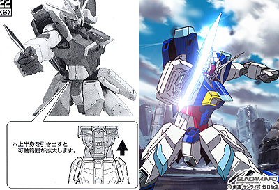 ▲組み立て説明書より。上半身を引き出すことで、フロントアーマーやサイドアーマーに干渉させずに腰を大きな角度でひねることが可能。これにより「フォールディングレイザー 対装甲ナイフ」を構えたオープニングのイメージに近いポージングを取ることができる。もちろんキットに付属のフォールディングレイザーは設定通り折りたためる上に腰サイドアーマーに収納可能だ。