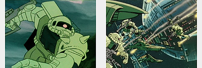 戦艦を撃沈し、スペースコロニーを地上へ落下させるザク。モビルスーツによる戦争は、兵器の概念を大きく塗り替えた。
