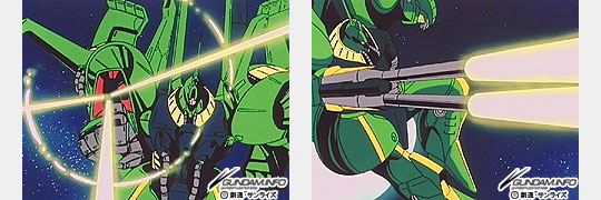 ビーム砲とミサイルを全身に装備。その火力は、ティターンズ旗艦ドゴス・ギアすら撃沈するほどのものであった。右腕には、2連装ビーム・ガンを装着。円形のシールドにはミサイルを内蔵している。