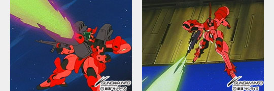 頭部にビーム・カッターを装備。腕部には強力な格闘武器、ビーム・トンファーを内蔵している。また、長距離攻撃用のメガビーム・キャノンは、一撃で戦艦を沈める威力を発揮。シュラク隊を始めとするリガ・ミリティアの主力部隊を、ことごとく撃破していった。